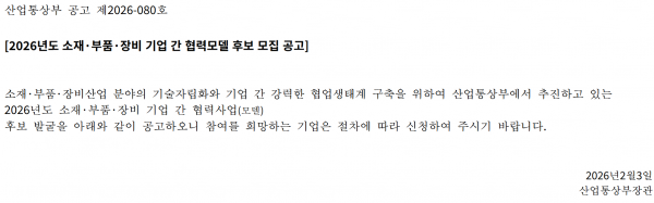 2026년도 소재·부품·장비 기업 간 협력모델 후보 모집 공고
